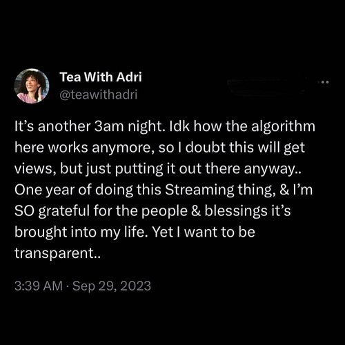 Your donations help grow, provide, and sustain the Communi-Tea. With every dollar, Tea With Adri exists because of your support. ♥ (NOTE: These are silent donations; if you would like to see an interaction on stream when you donate, visit streamelements.com/teawithadri/tip.)